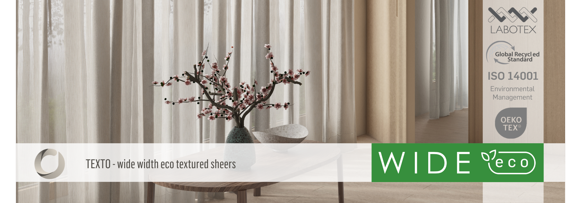Meet Texto, our beautiful Eco Wide sheer collection with a refined vertical texture - where style meets sustainability. Crafted to the highest environmental standards, Texto is GRS-certified, ISO 14001 complaint, and OEKO-TEX® approved, ensuring eco-conscious elegance for your interiors. Light, airy, and responsibly made - because design should feel good inside and out.